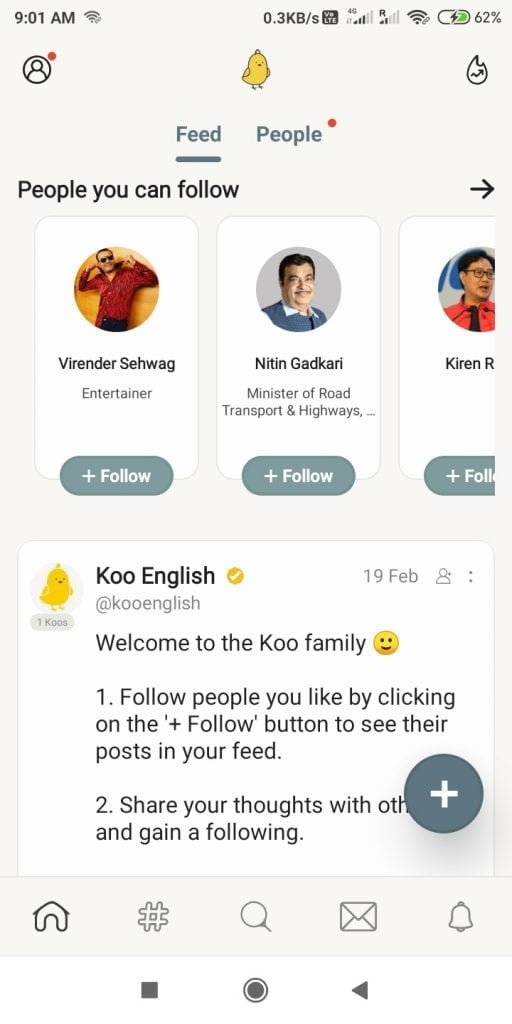 - कू फीड फीचर :- इस फीचर में आपको वह news देखने को मिलेंगे जिसे आपने फॉलो किया है और जो नया होता है . जैसे twitter में जो recent टॉपिक होते है और होम स्क्रीन पर आते है ठीक उसी तरह से कू फीड फीचर में भी आते है .